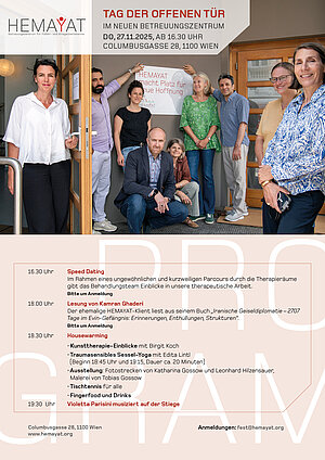 Wir freuen uns, Sie zum Tag der offenen Tür einladen zu dürfen. Im Juni 2025 ist HEMAYAT in ein größeres Betreuungszentrum in Favoriten umgezogen. Damit können wir unser vielfältiges Therapieangebot für unsere Klient:innen langfristig sichern und weiter ausbauen. Die neuen, von der Stadt Wien angemieteten Räume, sind wie ein Geschenk zu unserem 30-jährigen Bestehen: 14 helle, getrennt begehbare Therapieräume, inklusive spezieller Räume für Kinder-, Kunst- und Gruppentherapien.